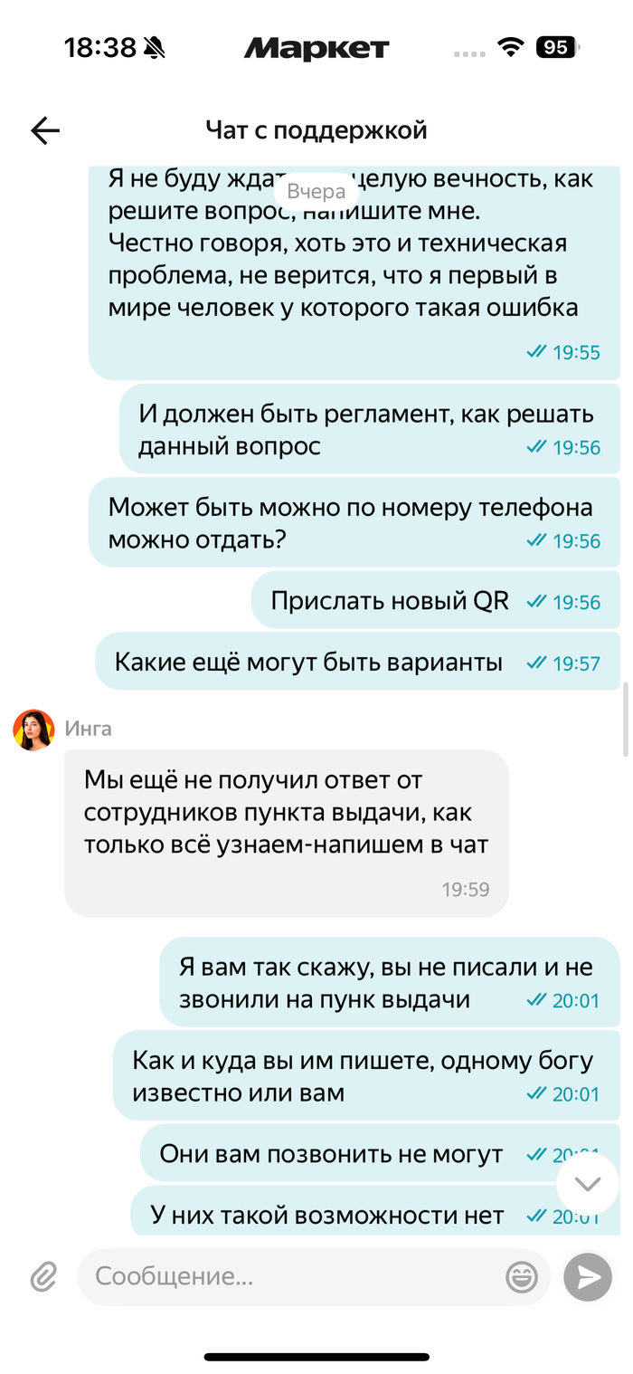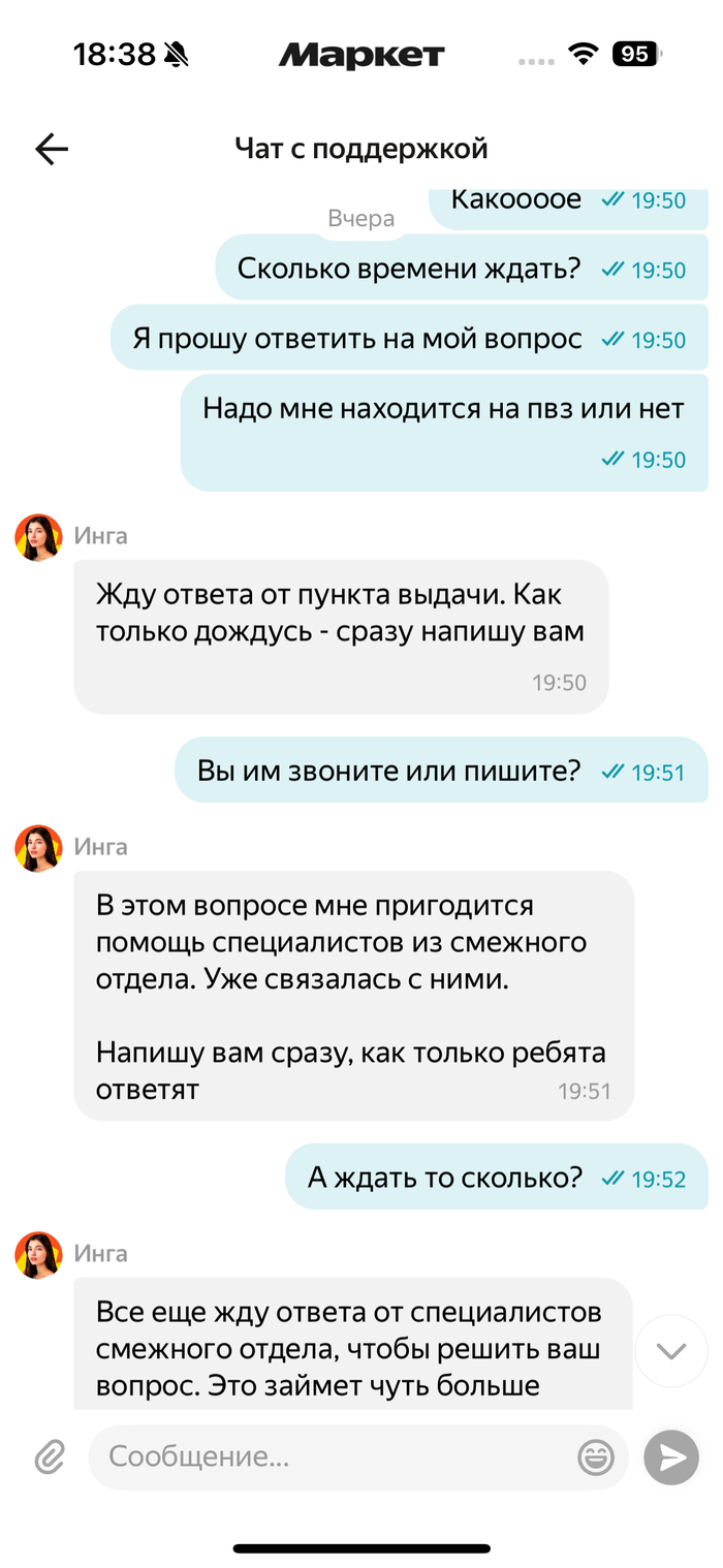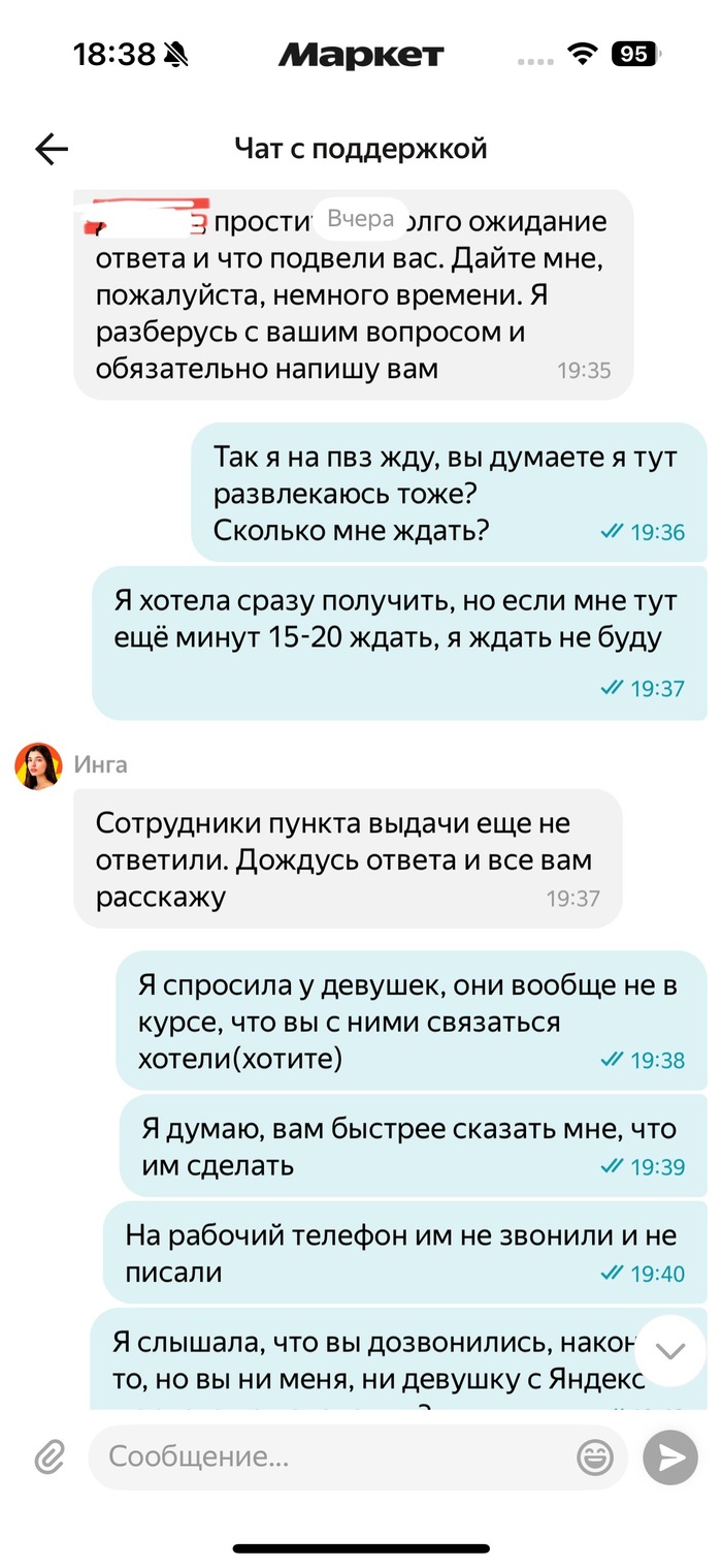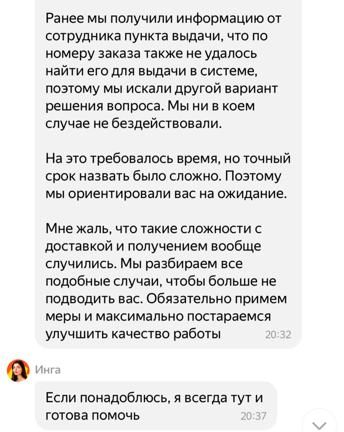 Всё это время я сидела в пвз, девушкам правда позвонили один раз, спросили, могут ли они по номеру пробить заказ, они сказали, что такой возможности нет, Яндекс отменил её неделю назад. На что им сказали, поняли, ладно, будем дальше думать как решить вопрос. Больше с ними за это время никто не связывался.