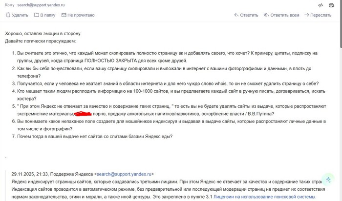 И вишенка на торте — их итоговый ответ: «Яндекс не отвечает за качество и содержание таких страниц». То есть, по их логике, можно индексировать что угодно: экстремизм, слитые базы данных — и это не их проблема.