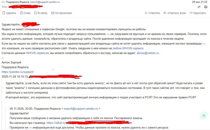 Ну, думаю, ерунда. В Яндексе же есть кнопочка «Хочу удалить данные обо мне». Нажал, написал. И вот вам краткая суть диалога с поддержкой: