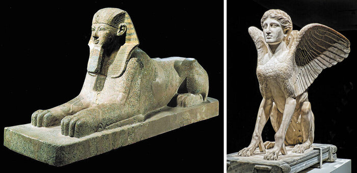 Образ сфинкса греки позаимствовали у египтян. Самый известный в мире сфинкс – это гигантское изваяние Большого сфинкса неподалёку от пирамиды Хеопса.