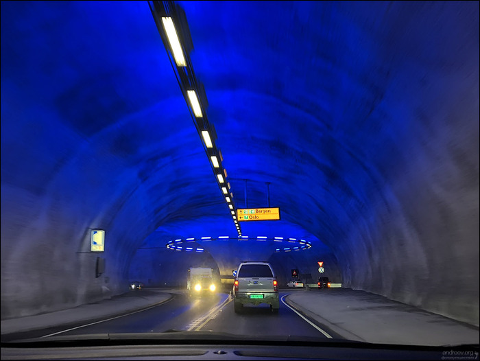 Вообще, Норвегия прямо-таки одержима постройкой туннелей. На данный момент их около 1300, включая самый длинный Лердальский (24,5 км) и самый глубокий – Ryfylke Tunnel, который пролегает на глубине почти 300 метров под водой. В некоторых туннелях имеются полноразмерные подземные кольцевые развязки, другие красиво подсвечены, третьи закручены в спираль. А многие еще и без всякой облицовки, как будто только вчера здесь прошли гномы с мотыгами. Едешь, а в голове звучит: “Та-та-та-та-та-тата-та-та-та…” 🙂