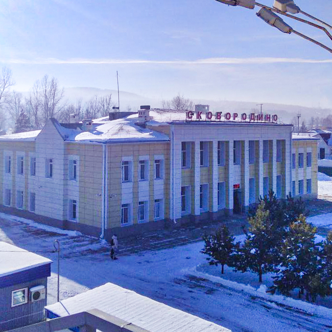 Собственно, знакомьтесь — городишко Сковородино, Здесь, уже, в отличии от нашего Урала и даже Благовещинска — уже такая твёрдая нормальная зима, с нормальной такой температурой — минус 15 °С
