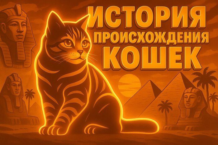 2️⃣ обложка для youtube видео, кошка с ярким золотым силуэтом на фоне древнего Египта, большой объемный текст "история происхождения кошек" яркий стиль