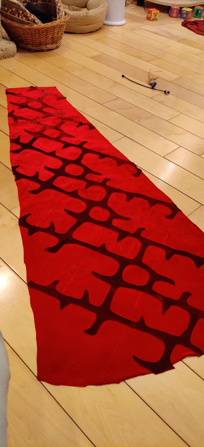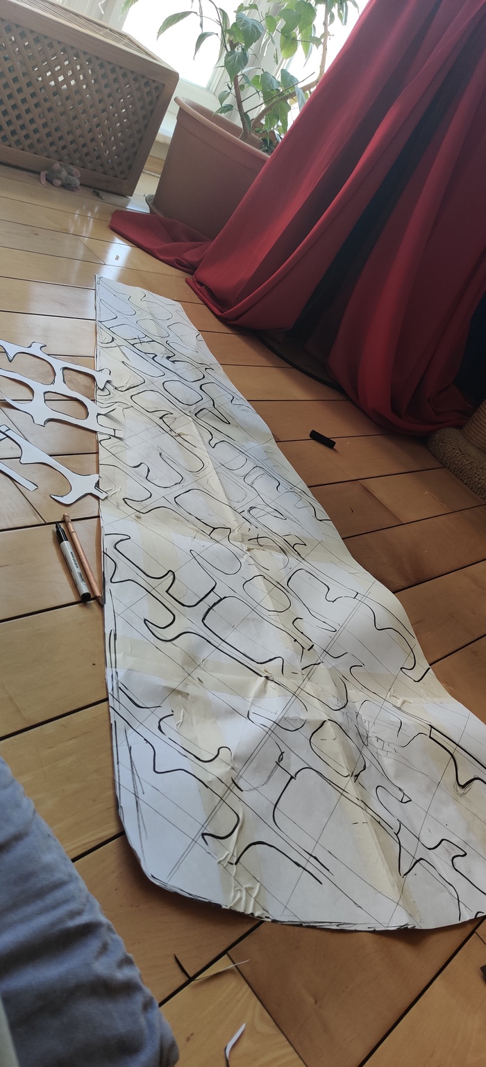 Чтобы добиться похожего эффекта, мне пришлось использовать кринолин на кольцах, жестоко над ним издеваться, красить его простигосподи краской из баллончика. Шлейф юбки Иврейн - отдельная история. Мне пришло в голову, что будет красиво изобразить на нем узоры, сделав аппликацию бархата на бархате. Поэтому сначала я провела несколько часов, пытаясь воспроизвести узор с миньки