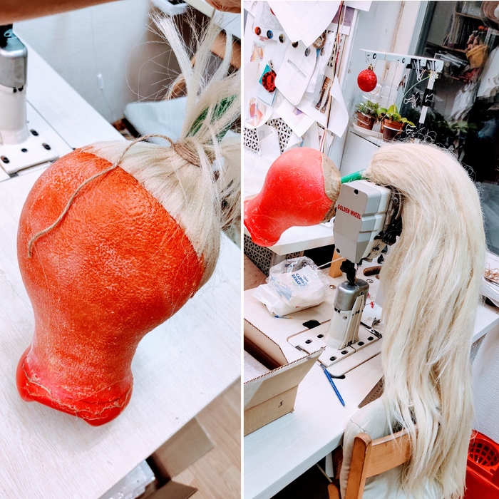 Далее хвост обшивался поролоном и чехлом из ткани, на которую впоследствии клеились волосы.