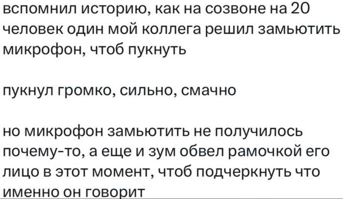А я как-то настроил по неопытности трансляцию всего экрана в зуме, и во время конфы человек на 10, включая представителей заказчика и их другого подрядчика любовница в телеге порадовала сообщением что багровые реки прошли и я могу подъехать трахнуть её. Удивительная выдержка присутствующих - никто даже не хрюкнул.