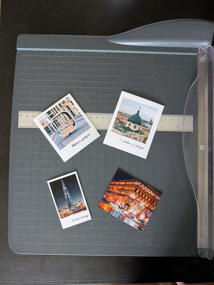 После печати наклеиваю фото на магнитный лист. Сам лист чуть больше по размеру, и это даёт небольшой запас — удобно, если криво положил. Далее — нарезка. Пользуюсь резаком, иногда — канцелярским ножом с линейкой. Честно скажу: пока получается не идеально. У сабельного резака ручка немного "гуляет", и края иногда скашиваются. Ну и руки, видимо, тоже немного кривоваты 😅