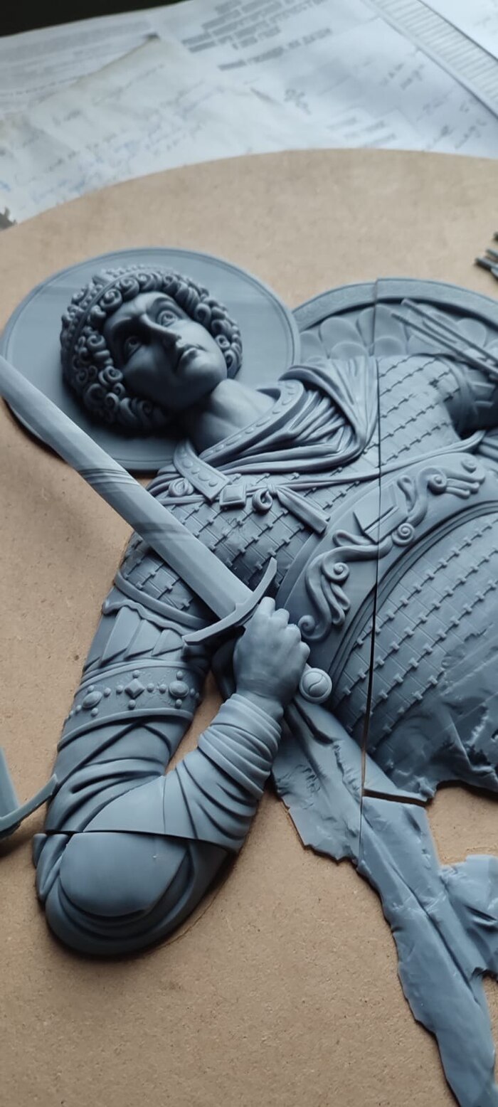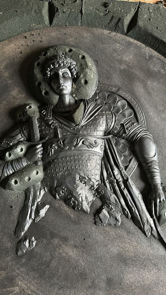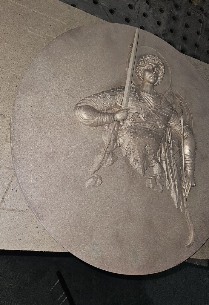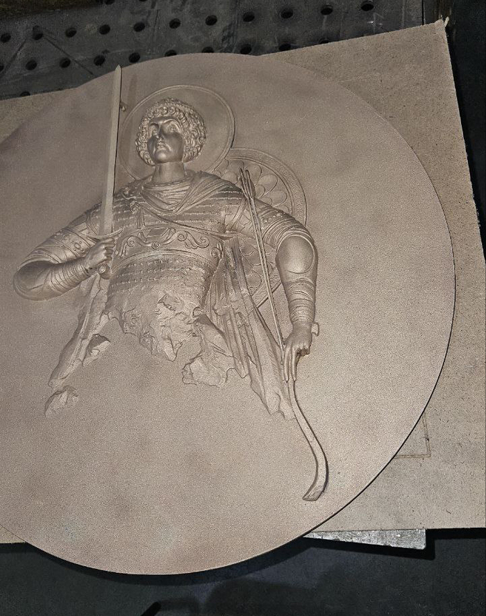 Сама бронза была отлита на основе 3D-модели рельефа Святого Георгия, который я слепил в 2024 году. Оригинальная цифровая скульптура была создана с использованием ZBrush, затем напечатана на 3D-принтере и отлита из бронзы с использованием ХТС (холоднотвердеющие смеси) формы.