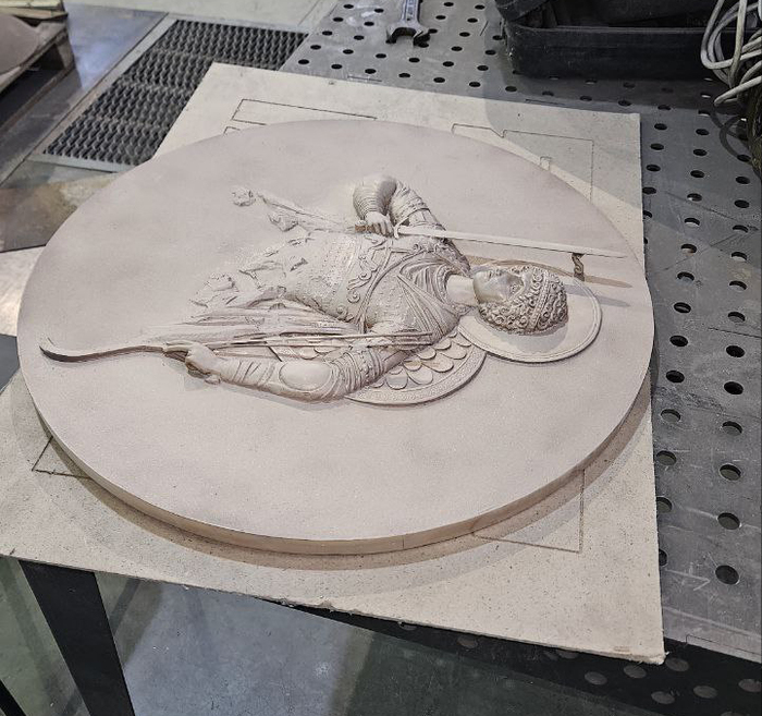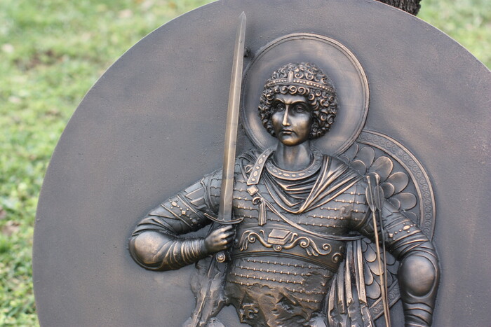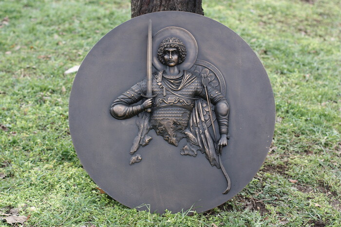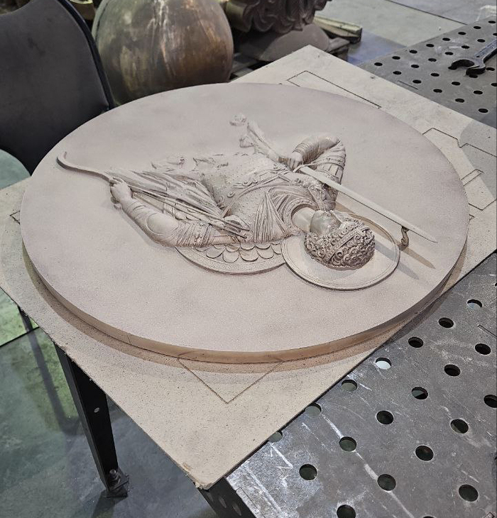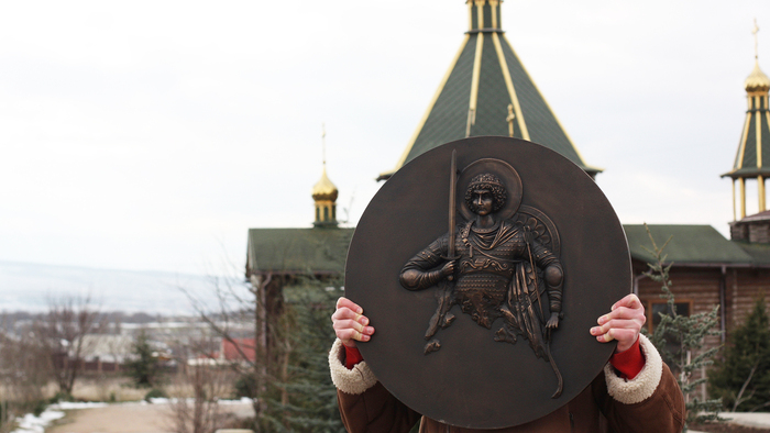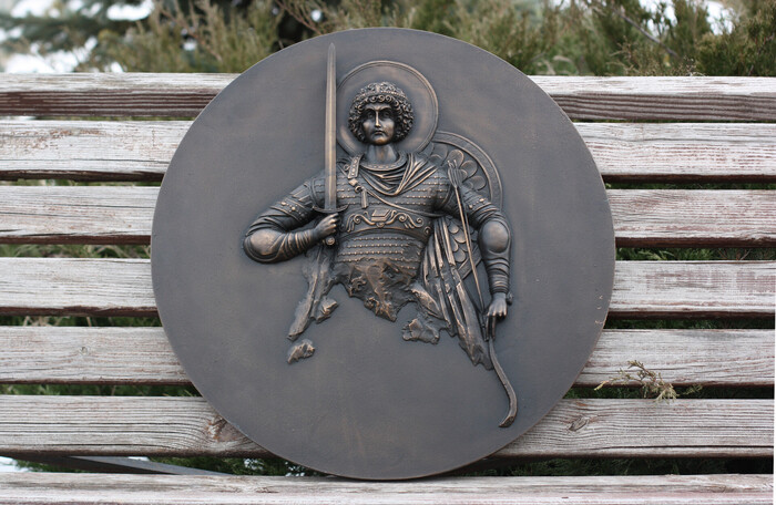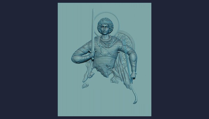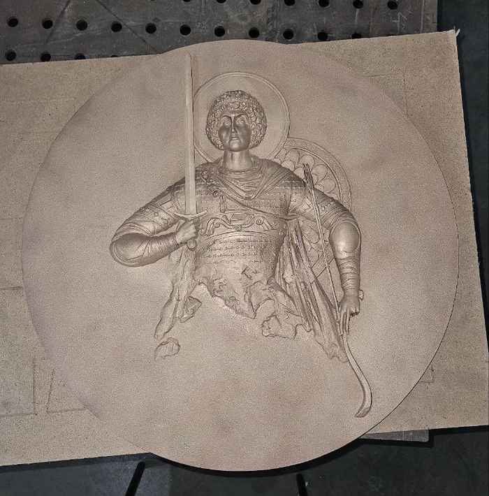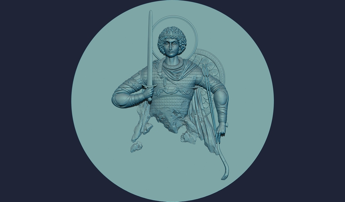 Сама бронза была отлита на основе 3D-модели рельефа Святого Георгия, который я слепил в 2024 году. Оригинальная цифровая скульптура была создана с использованием ZBrush, затем напечатана на 3D-принтере и отлита из бронзы с использованием ХТС (холоднотвердеющие смеси) формы.
