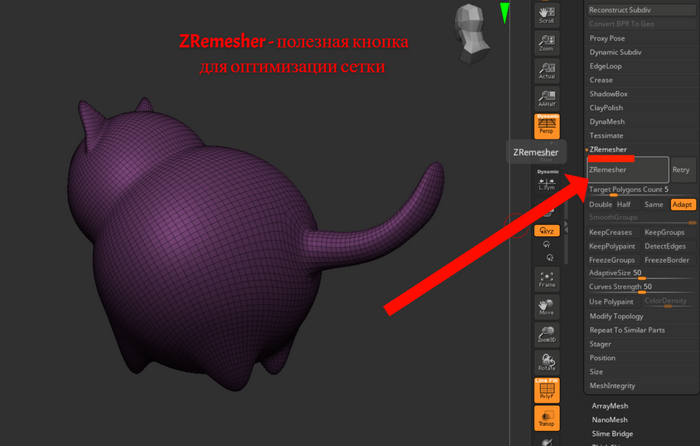 Обратите внимание, большое количество полигонов нормально для Zbrush, существует также кнопка ZRemesher для оптимизации сетки, но об этом я скажу в конце, как сделаем лапки и хвостик. Вы можете начинать от меньшего к большему количеству полигонов!!!! То есть сначала детализировать с малым количеством полигонов, но по мере надобности (детализации) увеличивать!!!!
