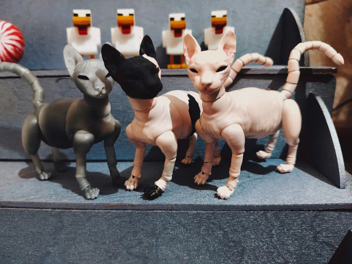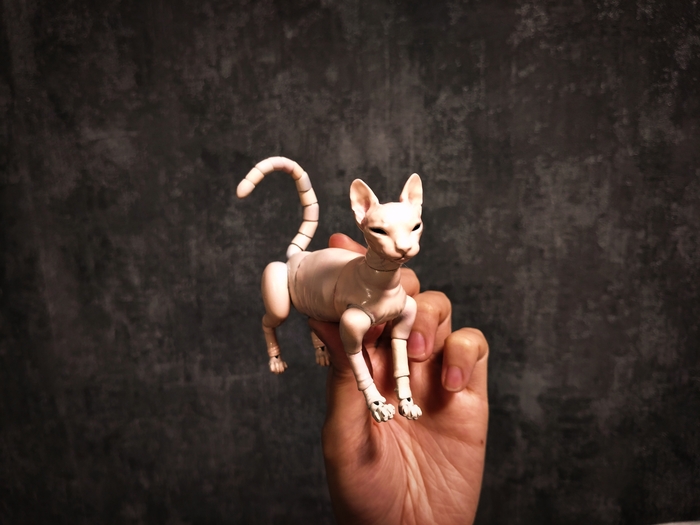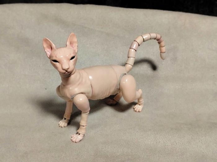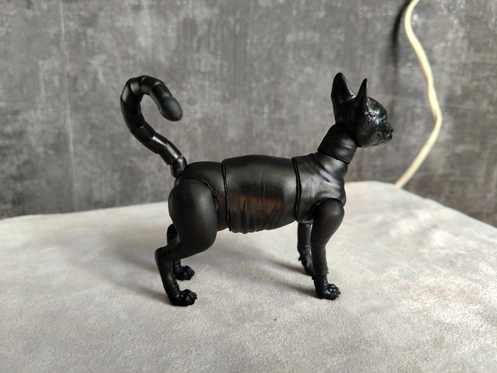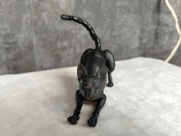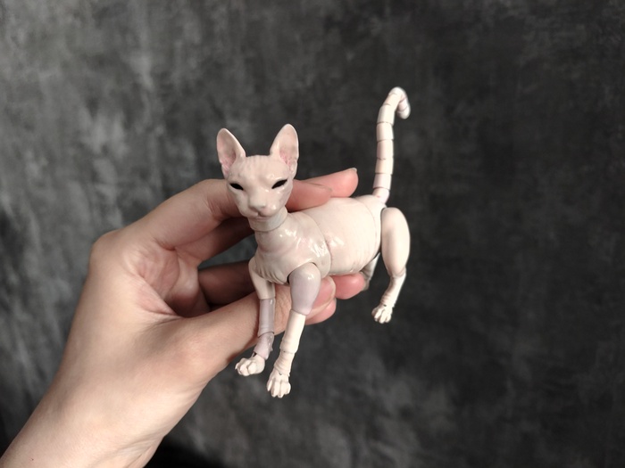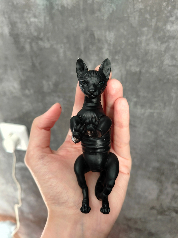 🩷 Я сделала модельку котика в программе ZBrush, печатаю на фотополимерном принтере, обрабатываю бормашинкой, обезжириваю, грунтую, крашу, покрываю лаком (использую полиуретановый), проклеиваю шарнироприемники тканью, чтобы краска не стёрлась, и собираю на резинку =)