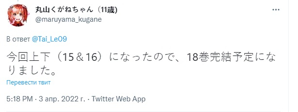 И последняя новость: Маруяма планирует закончить произведение на 18 томе(вместо 17) из-за разделения 15 тома на два.