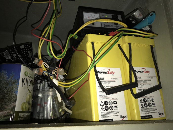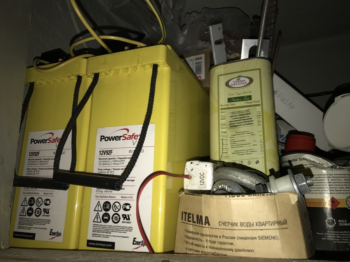 360Ач живой свинцовой мощи нахаляву..да, конечно если покупать такие аккумы, то цена в 23000 рублей за штуку сильно охладит пыл..но мне они достались даром, и как понимаете, мой замок месяц а то и два будет работать без напряжения в домашней сети..потом я ещё и пару светильников на этот бесперебойник повесил, хотя у нас и практически свет не отключают, но так, на всякий пожарный..