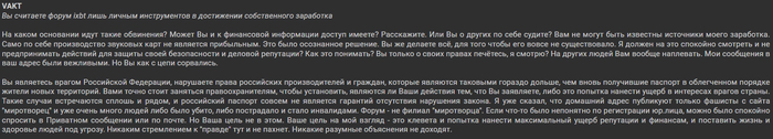 Увы, мой комментарий сначала редактируют, следом меня банят, потом сообщение вообще удаляют. Причём банят не за мат, не за оскорбления, а за… внимание… клевету, разглашение личных данных и даже терроризм! Серьёзно, мне предложили самому опубликовать свой адрес, раз я такой борец за правду, а заодно намекнули на ФСБ и МВД. Видимо, в следующий раз стоит ожидать визит группы захвата с криком «Лицом к полу, это за комментарий на форуме!».