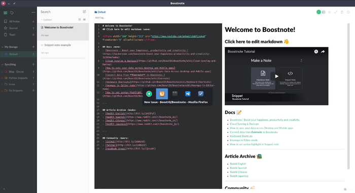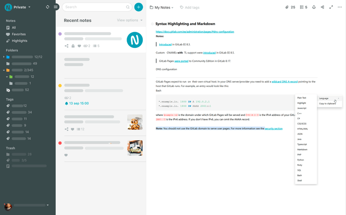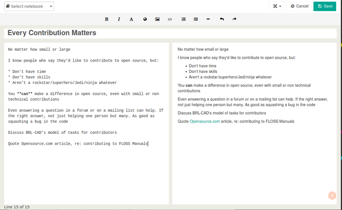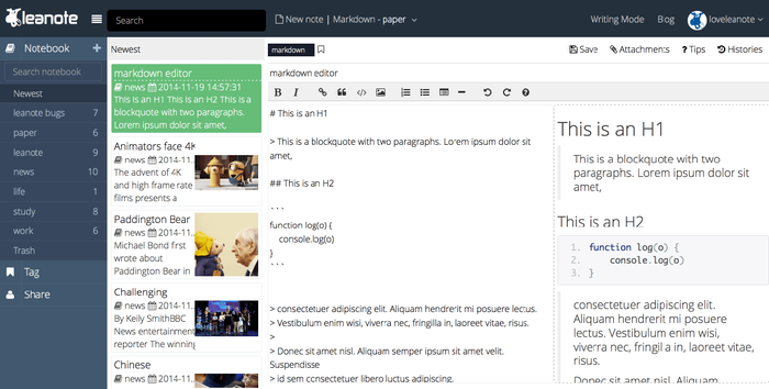 Программа для создания заметок, аналог Evernote и недавно ставшего платным Wiznote, с открытыми исходниками. Есть клиенты под Windows, iOS, Android (пока что клиент стороннего разработчика, родной в разработке), Mac ну и веб интерфейс конечно. Клипперов, пока, нет. Поддерживаются заметки в виде как обычного текста, так и в виде форматированного HTML, с поддержкой разметки. Есть оффлайн режим, те однажды синхронизировав заметки, в дальнейшем можно пользоваться приложением без Интернета. Есть экспорт заметки в pdf/HTML, можно раскладывать заметки по многоуровневым папкам, корректный поиск по русским словам.