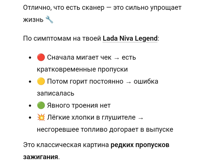 Я сообщил ЧатуГПТ, что у меня Нива Легенда 2022 года с двигателем 1.7, и что у меня то мигает, то горит чек. Затем были несколько уточняющих вопросов.