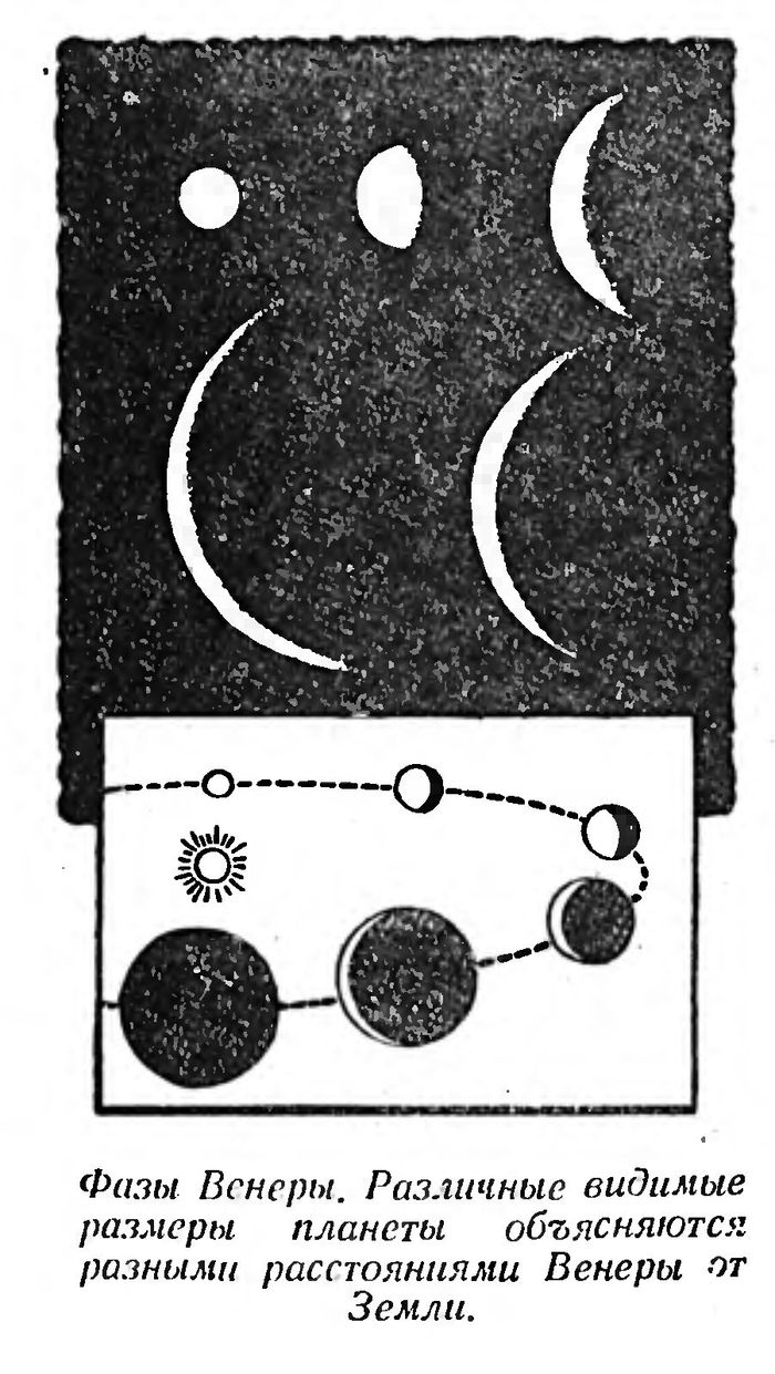 В практическом доказательстве этой важной гипотезы немалая заслуга принадлежит Галилею. Направив созданный им первый, еще маленький и весьма несовершенный телескоп на планету Венеру, он увидел перед собой вместо точки, какой Венера представляется невооруженному глазу, небольшой диск. Форма этого диска менялась по мере перемещения планеты по отношению к Солнцу, проходя ту же самую последовательность фаз, которую каждый знает на примере Луны. Из этого следовало, что, подобно Земле, Венера является темным шарообразным телом, которое сияет исключительно за счет отражения солнечных лучей и на котором, как и у нас, происходит смена дня и ночи.