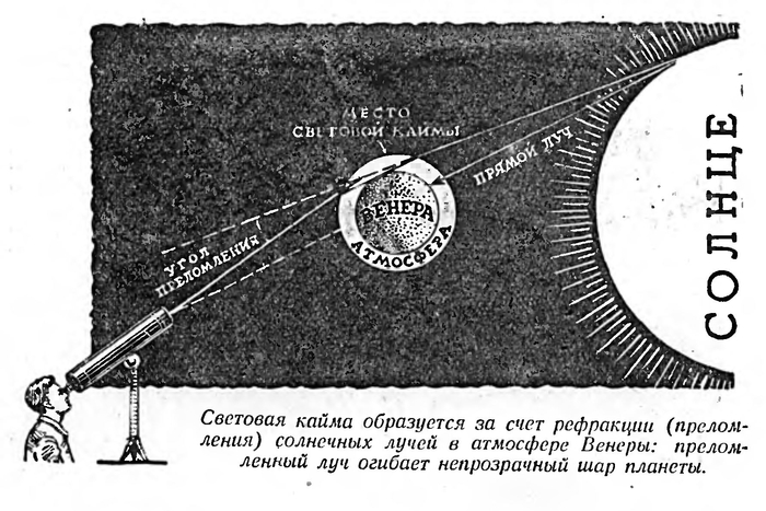 Лет через 30 после открытия Ломоносова было замечено еще одно весьма интересное явление. Выяснилось, что когда диск Венеры имеет вид серпа, то светлая его сторона простирается больше, чем на полуокружности. В случае с простым матовым шаром этого не могло бы быть, ибо Солнце освещает только половину его и никак не больше. Поскольку же светлый край Венеры превосходит 180 градусов и при очень узком серпе даже смыкается в сплошное бледное кольцо, то это значит, что солнечными лучами освещается не только полушарие, обращенное к дневному светилу, но и примыкающая к нему зона ночной стороны планеты. Объяснить это можно только существованием атмосферы на Венере.