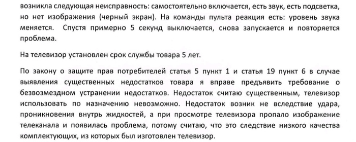 Предварительно пытался сдать его в АСЦ и сделать диагностику, но мне сказали, что в диагностике будет описан дефект, при этом для суда бумага совершенно бесполезная. Написал претензию, в конце предложил самостоятельно сдать телевизор в конкретный авторизованный сервисный центр.